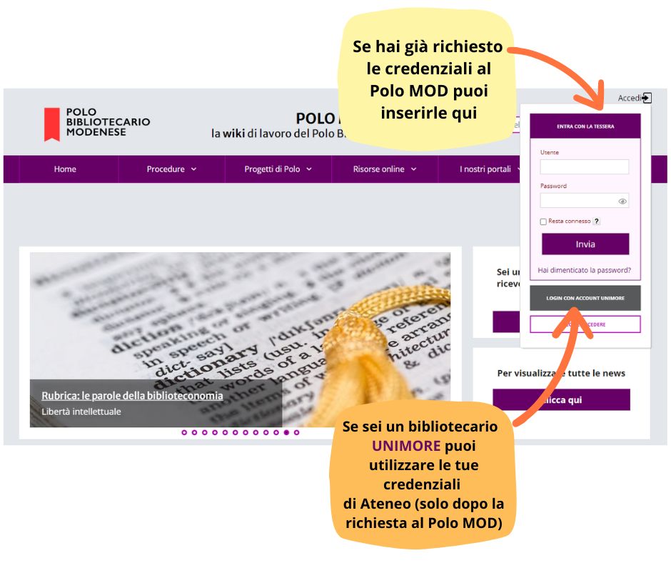 - se lavori in una biblioteca del Polo Bibliotecario Modenese e non hai ancora richiesto le credenziali per accedere, compila questo modulo online.